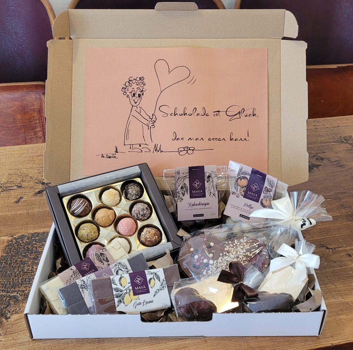 Außerdem legen wir eine Maya Info-Karte und eine Trüffelpralinen-Beschreibung bei.